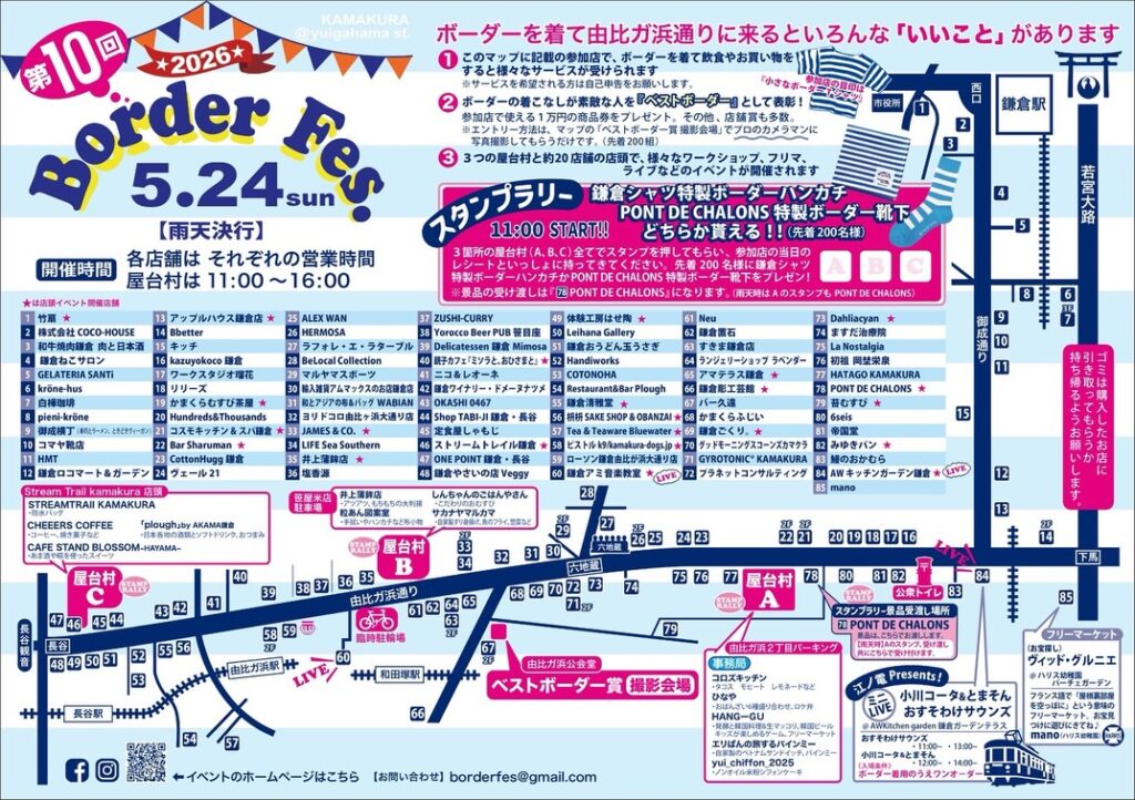 エリア内に設置された3つの屋台村(A・B・C)を巡るスタンプラリーを完成させ、当日参加店で飲食・お買物して頂いたレシートをお持ちいただくと、鎌倉の人気ブランド「メーカーズシャツ鎌倉」や「ポンデシャロン」の特製ボーダーグッズがもらえます(数量限定)。