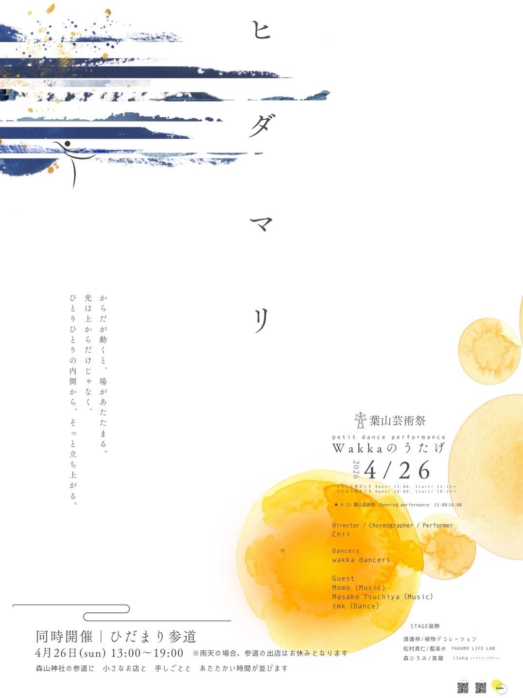 そのオープニングを飾る注目のステージが、ダンスユニット wakka によるパフォーマンス 『ヒ ダ マ リ』 です。森山神社の静謐な空気の中、世代を超えた踊り手たちが、光と音に包まれる特別なひとときを届けます。