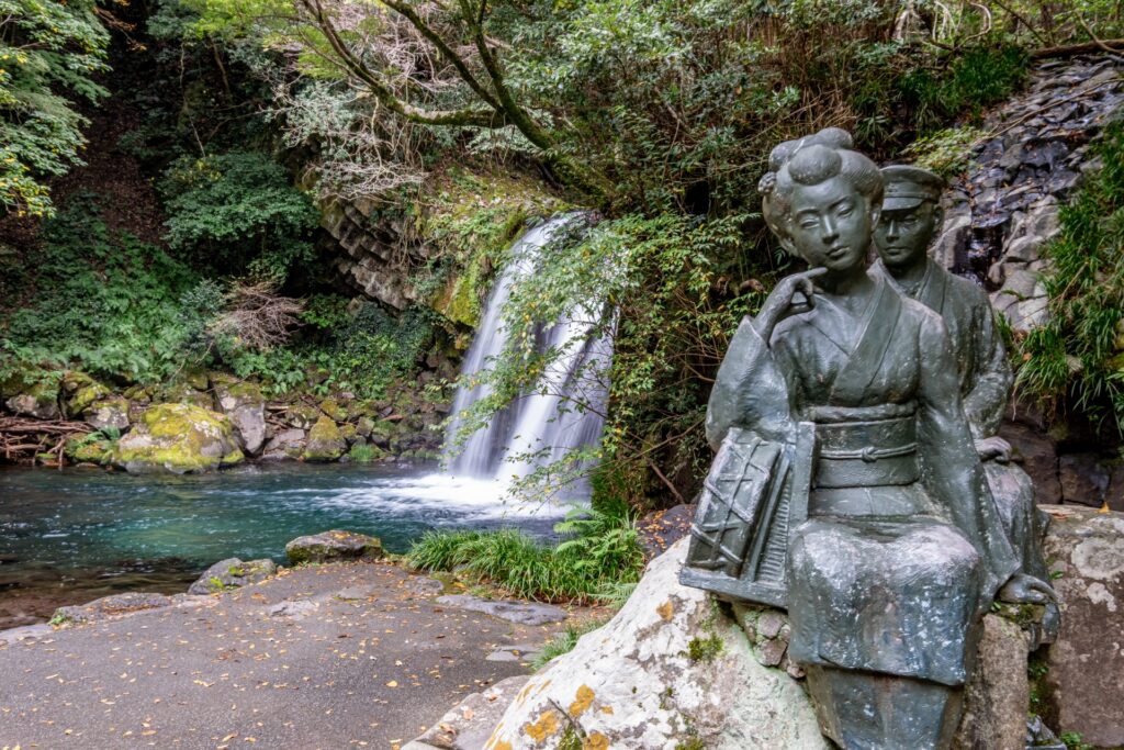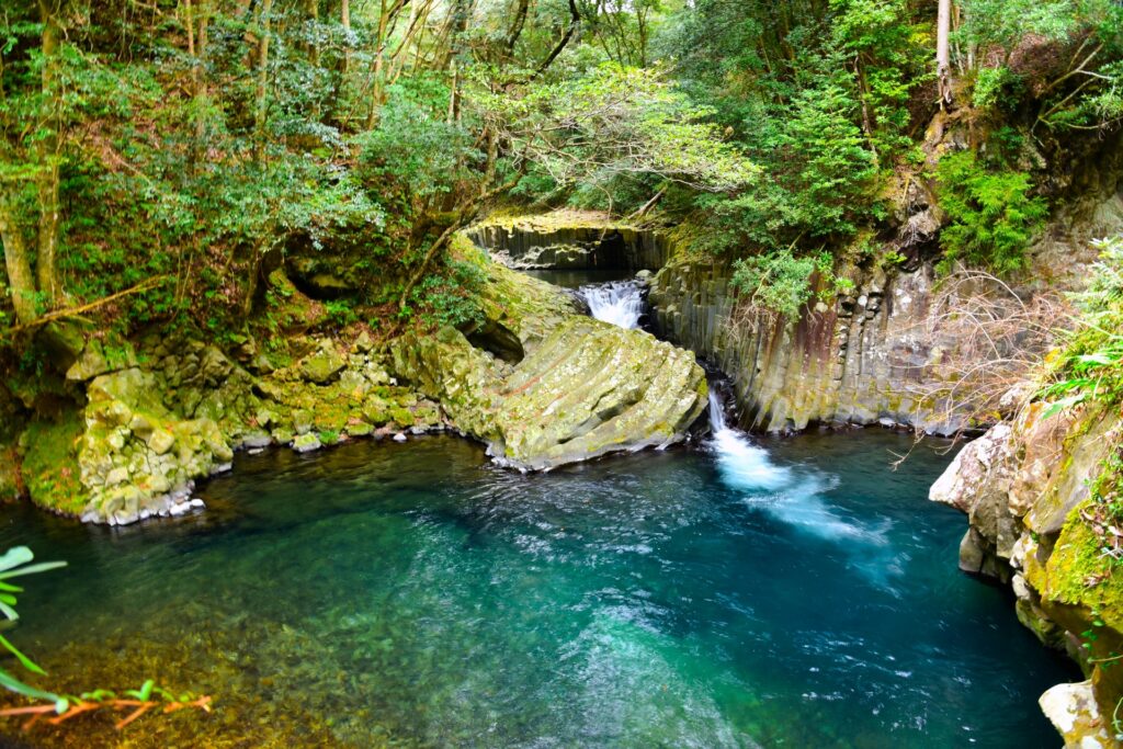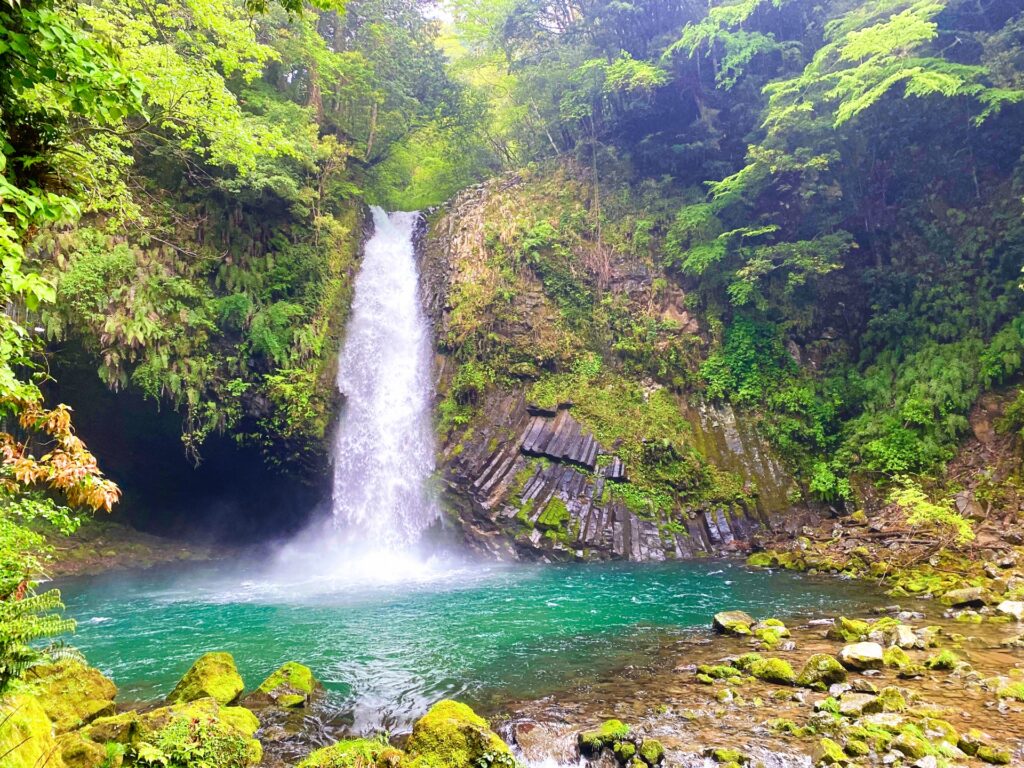 - 浄蓮の滝(伊豆市): 名曲『天城越え』でも知られる名瀑。この滝もまた、鉢窪山という火山の噴火で流れ出た溶岩流の端にできています。周囲の岩壁に見られる柱状節理は見事の一言。