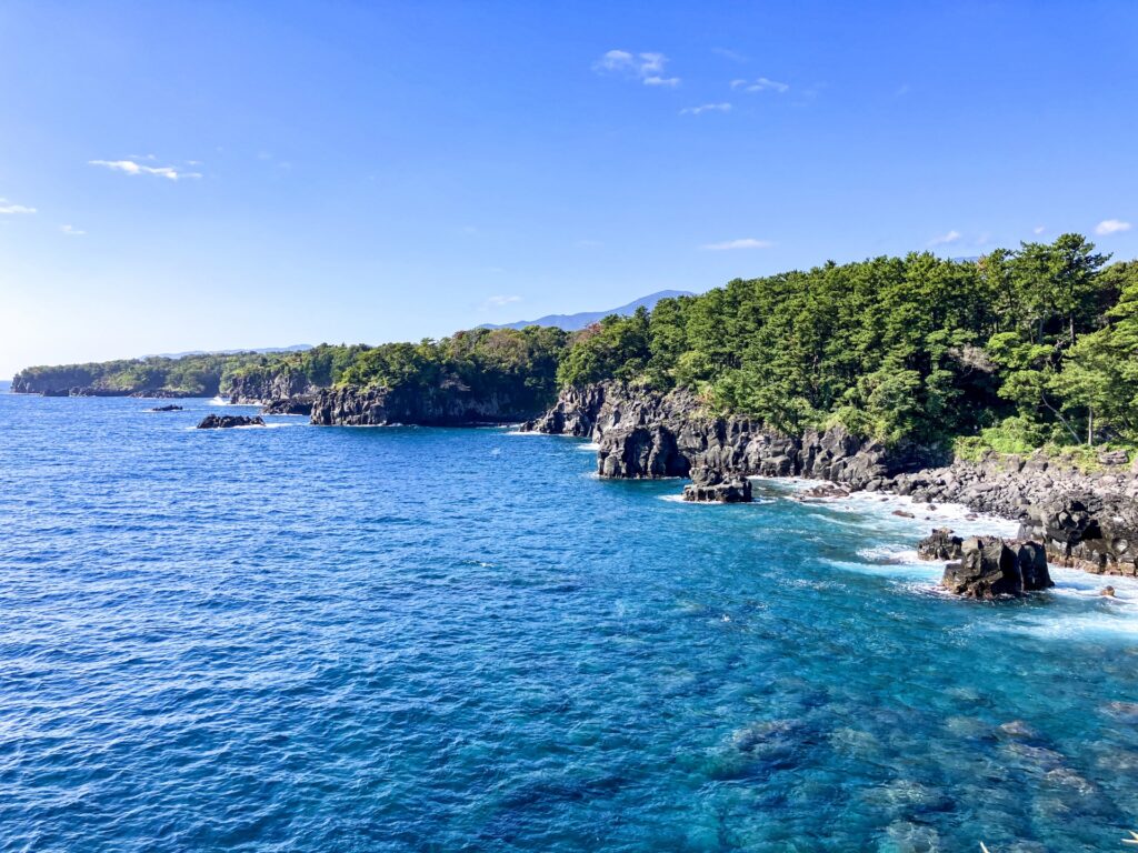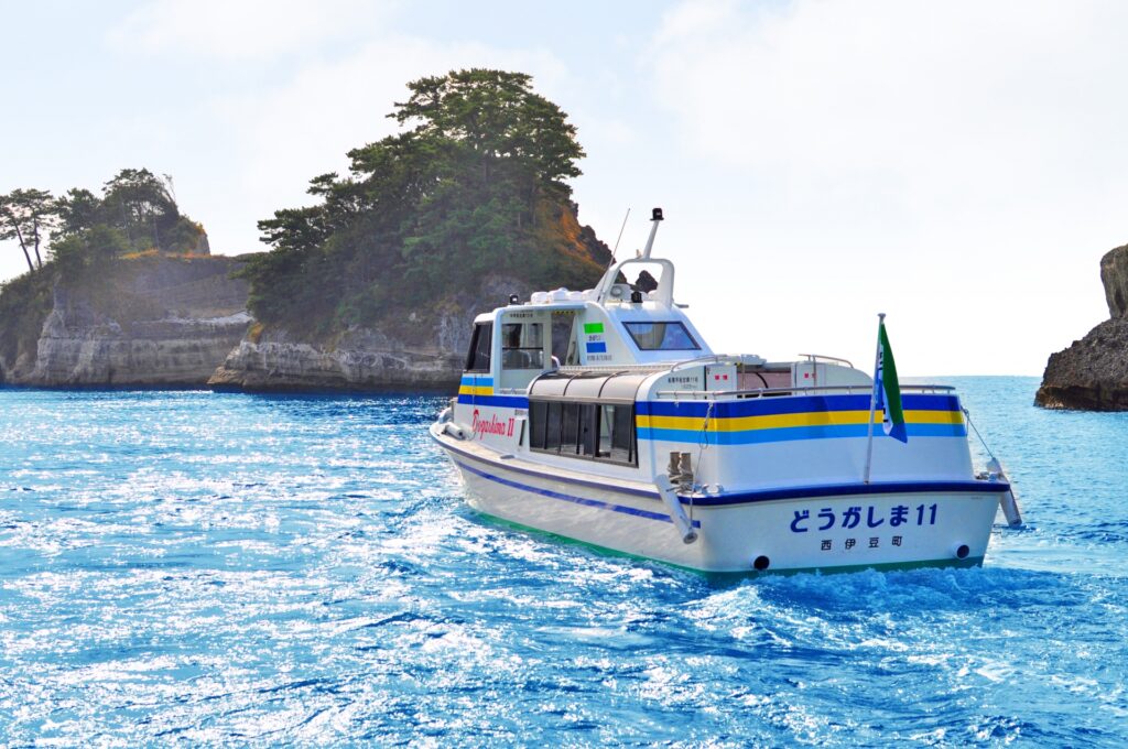 - 堂ヶ島(西伊豆町): 「伊豆の松島」とも呼ばれる景勝地。白い火山灰層と青い海のコントラストは絶景です。遊覧船に乗って「天窓洞(青の洞窟)」に入れば、光が差し込み、海面が神秘的な青色に輝きます。