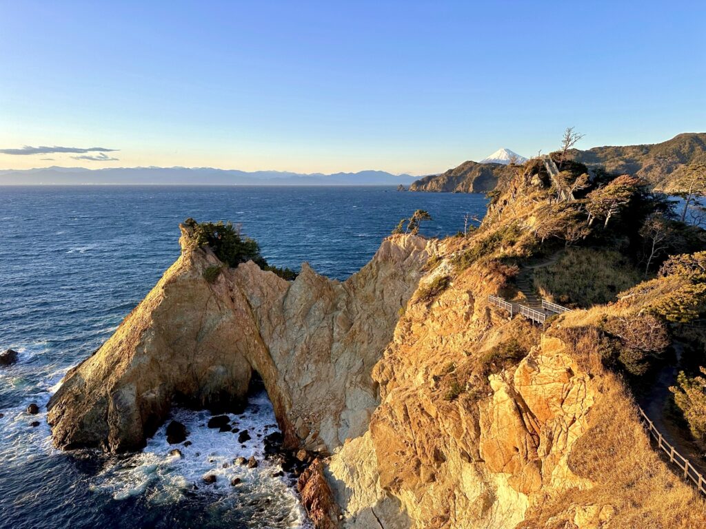 - 城ヶ崎海岸(伊東): 大室山の噴火で流れ出した溶岩が海に流れ込み、冷え固まってできた断崖絶壁。黒々とした岩肌に波が打ち寄せる様は迫力満点です。吊り橋から下を覗けば、ここが火山の島であることを肌で感じられます。