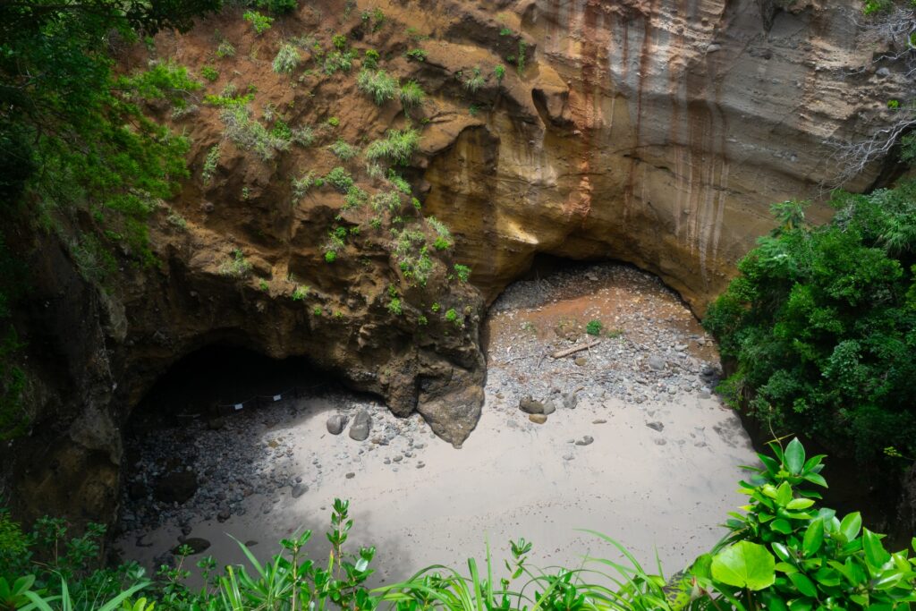 - 龍宮窟(下田): 波の侵食によって崖の一部が削られ、天井がぽっかりと開いた洞窟。上から覗き込むとハート型に見えることで人気ですが、これも海底火山の噴出物が層になってできた地層のアートです。