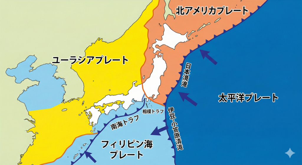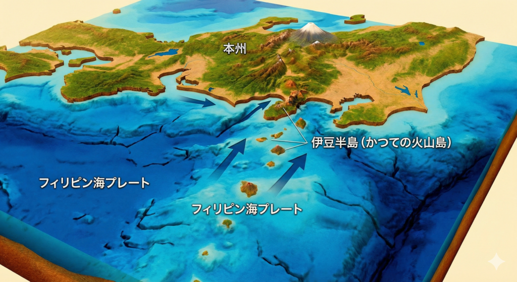 遥か昔、伊豆は現在の硫黄島付近と同じ緯度にある、海底火山の集合体でした。 それが「フィリピン海プレート」に乗って、長い時間をかけて北上し続けました。 そして約60万年前、本州(日本列島)に「ドーン!」と激突。この衝突によって隆起し、半島となったのが現在の伊豆半島です。