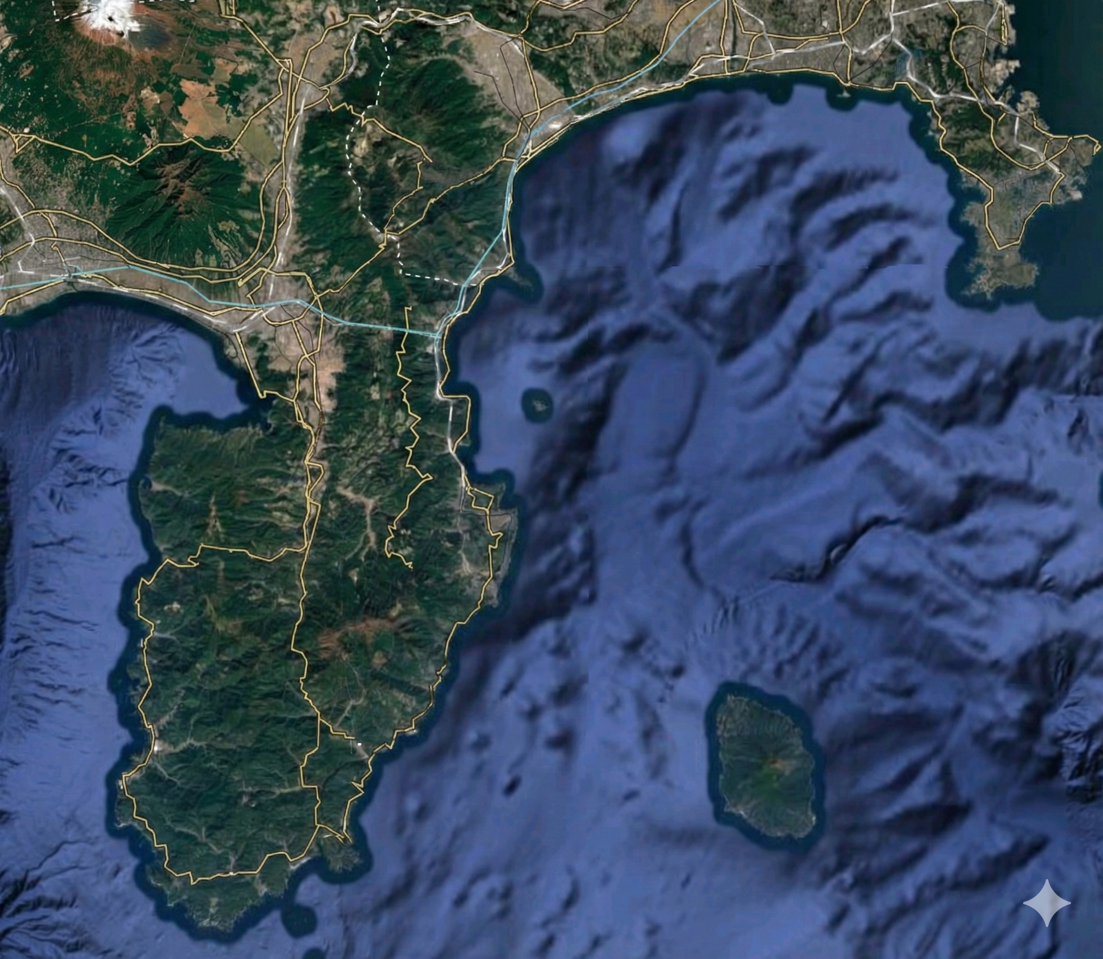 湘南から見ると、夕陽が沈んでいく方向。西伊豆は、海底火山の活動の痕跡が最も美しく残る場所です。
