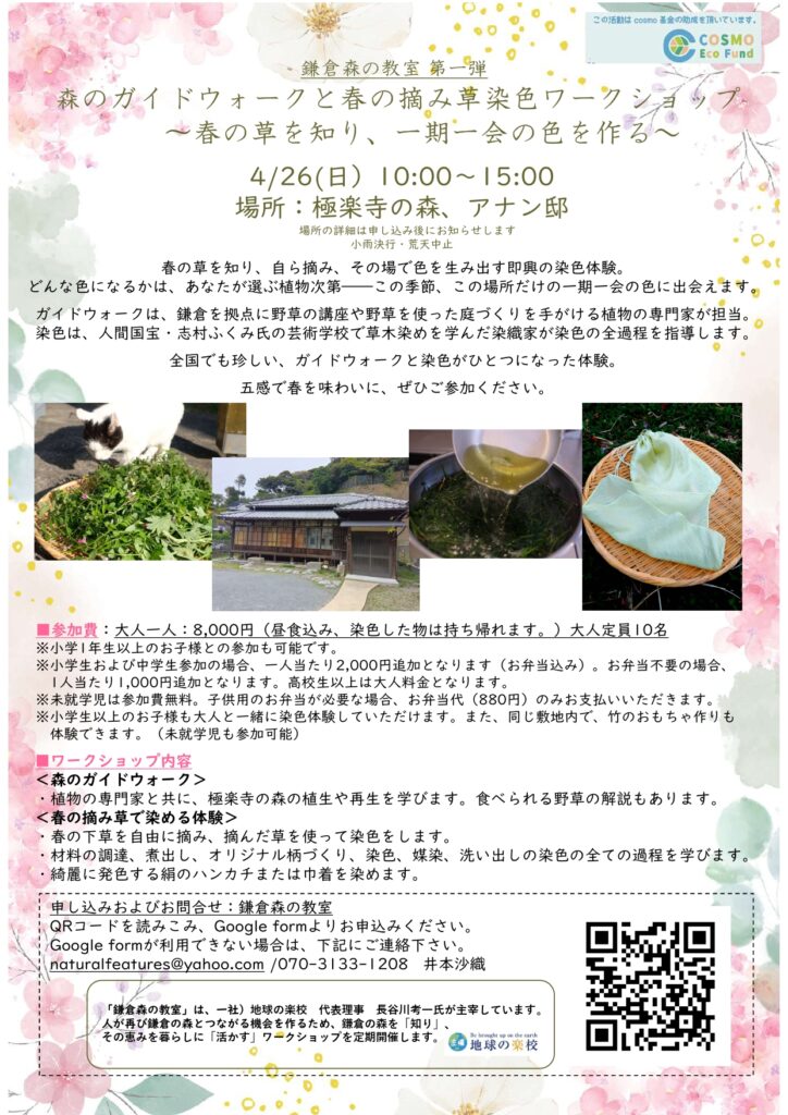その名も、「鎌倉森の教室 第一弾|森のガイドウォークと春の摘み草染色ワークショップ~春の草を知り、一期一会の色を作る〜。