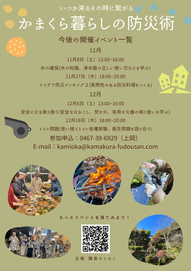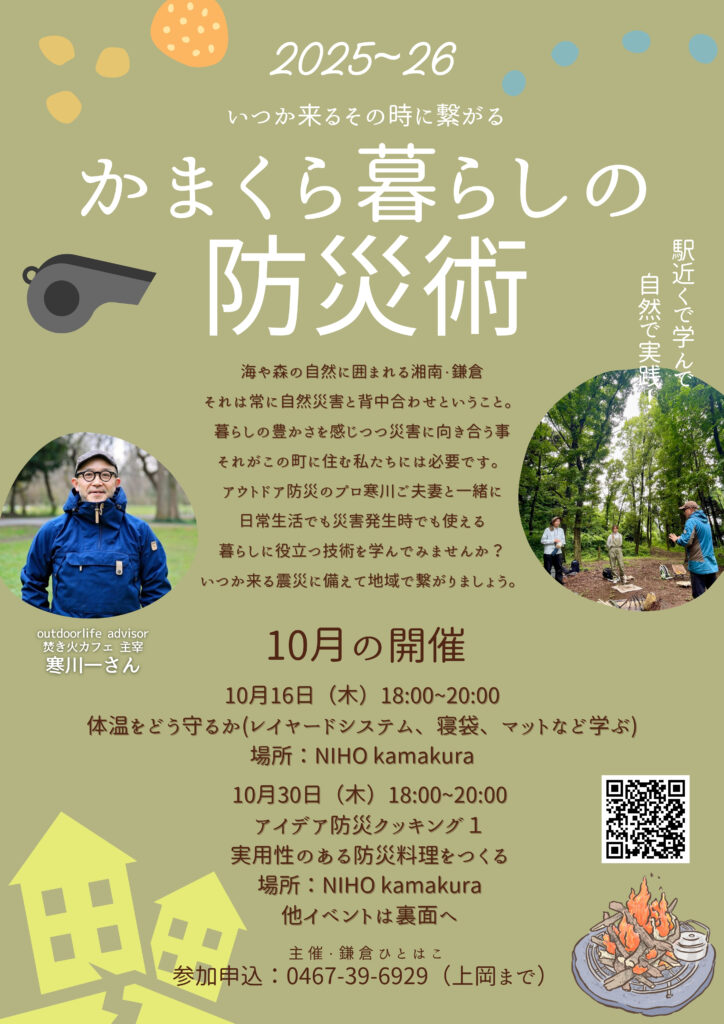 […] 開催されるイベントと詳細がこちらからご覧いただけます。①それぞれの備えを考えよう(個人の必要なものに焦点をあて、非常時持ち出しパックをつくる)②アウトドア防災の可能性(衣食住、オフグリッド、生きる優先順位などを学ぶ)③体温をどう守るか(レイヤードシステム、寝袋、マットなど学ぶ)④アイデア防災クッキング1(実用性のある防災料理をつくる)寒川セツコ⑤水の確保(水の知識、浄水器の正しい使い方などを学ぶ)⑥安全に火を取り扱う(安全な火おこし、焚き火、有用な火器の取り扱うをフィールドで学ぶ)※⑦アイデア防災クッキング2(実用性のある防災料理をつくる)寒川セツコ⑧トイレ問題(使い捨てトイレ各種実験、衛生問題を語り合う)⑨楽しいロープワーク(日常で実用性の高いロープワークを学ぶ)⑩シェルターづくり(ロープ、シートで森でシェルターをつくってみる)※⑪鎌倉の地形を学ぶ(ハザードマップや等高線などから鎌倉独自の地形を学ぶ)⑫役立つ防災アイデア(日常の小さなアイデアからキャンプにも役立つアイデアまで、みなで共有しましょう) […]