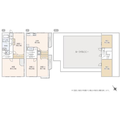 1階14.3帖+8.3帖、2階LDK約13帖+洋室2部屋。屋上専用使用権付き。