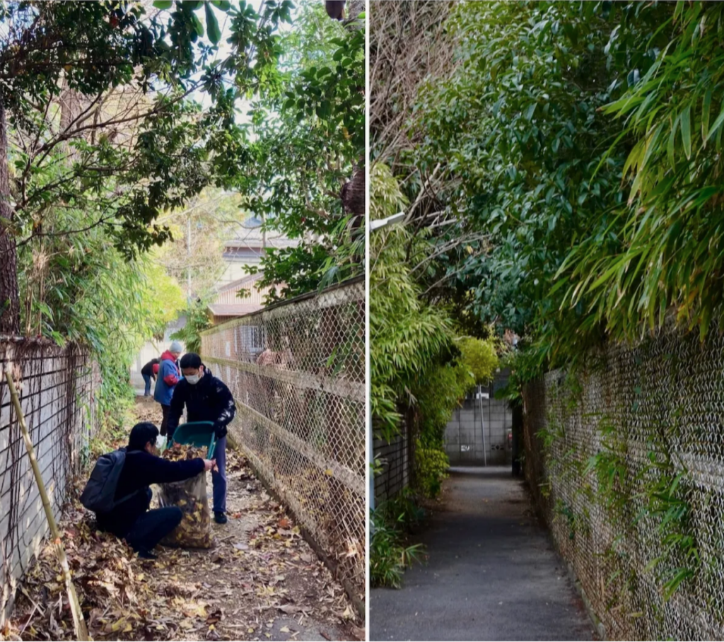 この冬一番の冷え込みとなった当日、集まったのは初参加も含め26人。持ち寄った竹ぼうきなどで、庭や周囲の路地の落ち葉などを集めた。長い間、手付かずだったという裏手の人通りが少ない細い路地は、地面が見えないほど落ち葉が積もっていたため時間がかかった。たまたま通りかかった近所に住む女性は「この量だと私のような年配者には掃除ができずに困っていた。たばこを吸って歩く人を見かけることもあり、心配だったので大変ありがたい」と話した。
