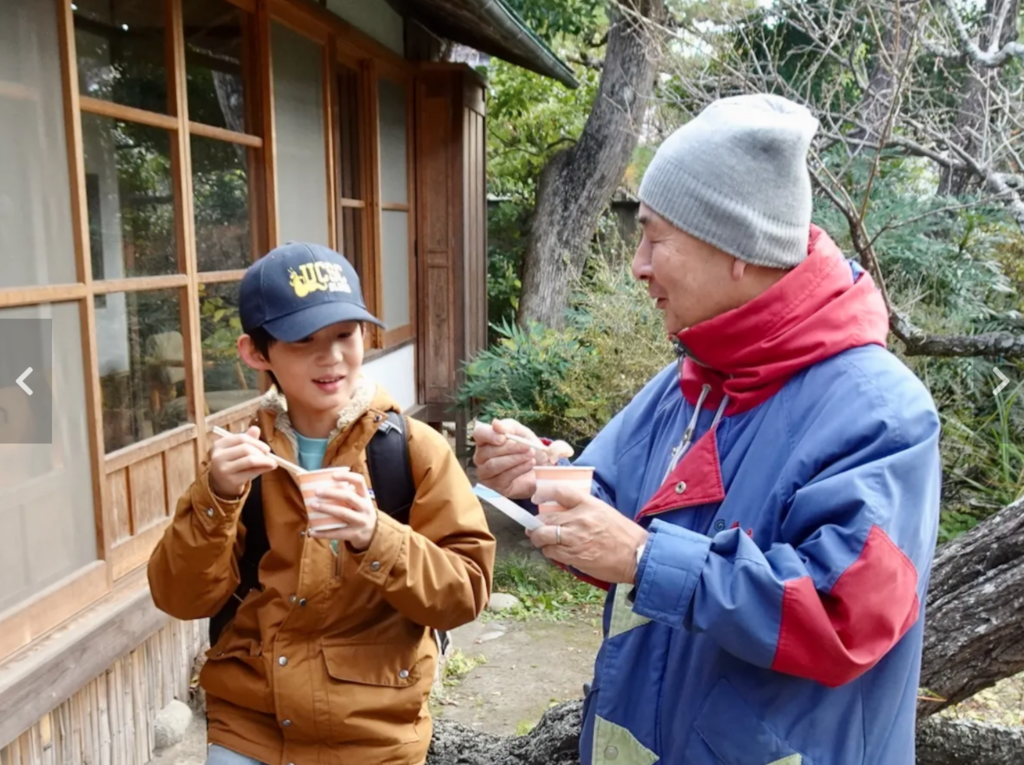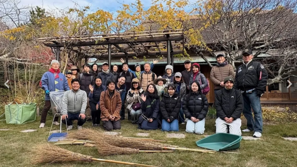 1時間ほどで作業を終えたメンバーは、佐藤さんが用意した白玉入りの汁粉で暖を取り、「トングではなく、久しぶりにほうきを使い疲れた」「いつもは自然のものはあえて拾わないが、今日は枯れ葉を中心に集めるという新鮮な体験だった」「貴重な建物の掃除の手伝いができてうれしい」「カフェ営業時にも訪れてみたい」「ここで過ごした大佛さんの本を読んでみたくなった」などと話していた。