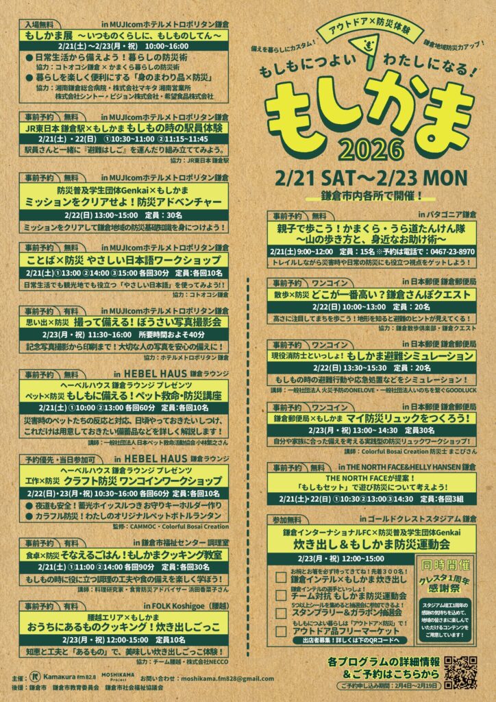 - 炊き出し&もしかま防災運動会(2/23)ゴールドクレストスタジアム鎌倉(クレスタ)で開催。鎌倉インテルの選手と一緒に、毛布担架やジャッキ体験など、体を動かして防災を学びます。