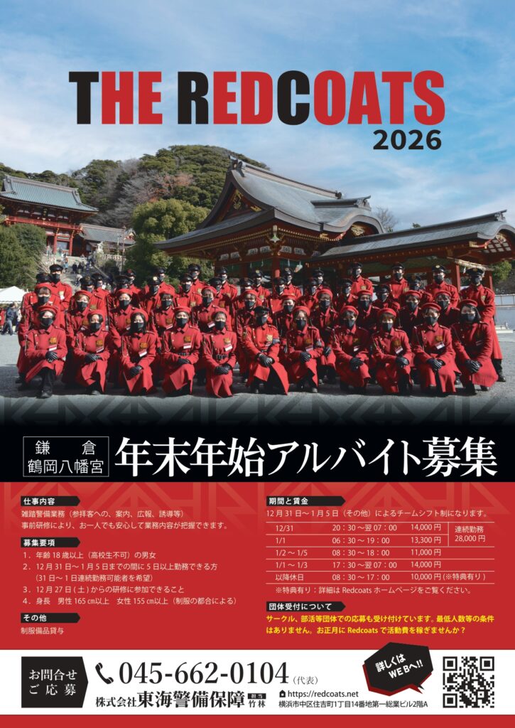 東海警備保障株式会社では、毎年恒例の鶴岡八幡宮 初詣警備アルバイト「REDCOATS(レッドコーツ)隊」を募集しています。