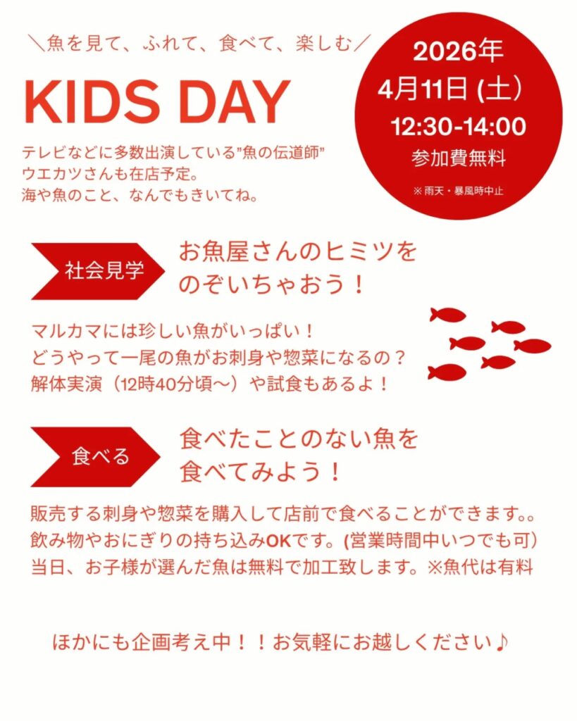 当日は、お子様が選んだお魚を無料で加工してくれる嬉しいサービスも(※魚代は有料)。 店前でそのまま食べることも可能です。飲み物やおにぎりの持ち込みもOKなので、マルカマ自慢の惣菜と合わせて、青空の下で美味しいランチタイムはいかがでしょうか?