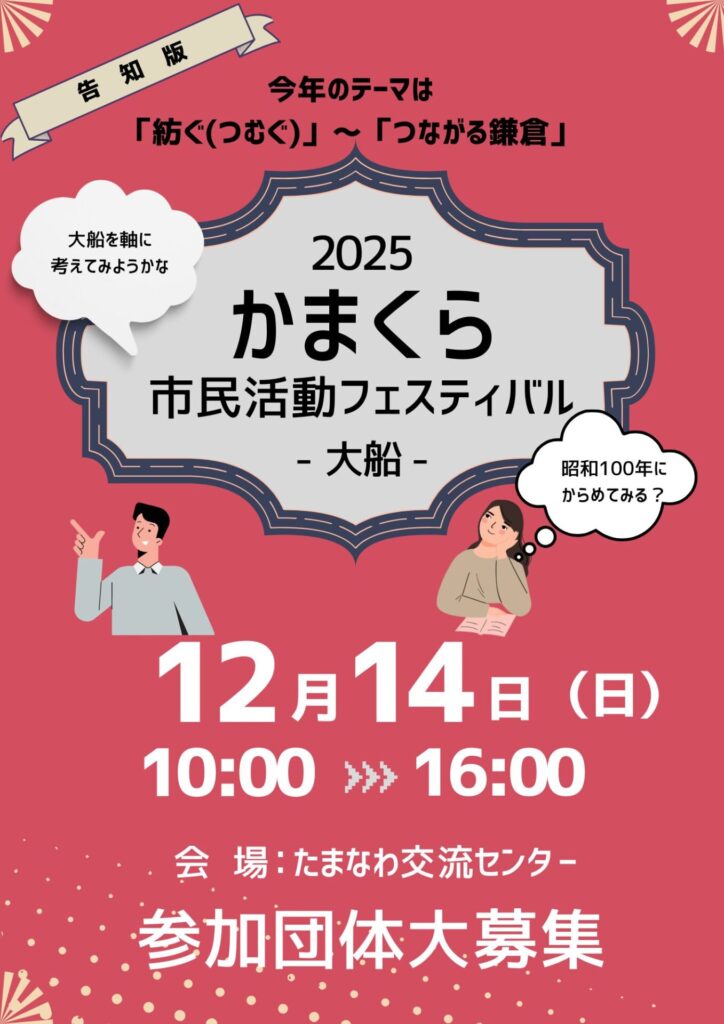 イベント概要 開催日: 2025年12月14日(日)10:00〜16:00会場: たまなわ交流センター(鎌倉市台1-2-25/JR大船駅西口から徒歩3分)主催: 鎌倉市市民活動センター(指...