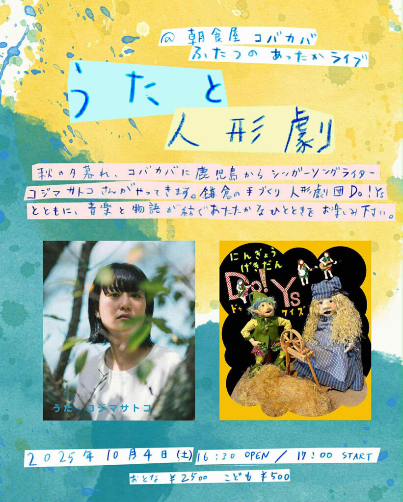 いよいよ 10月4日(土)、鎌倉・小町の朝食屋コバカバでKAMAKURA POETRY FESTIVAL 「うたと人形劇」 が開催されます。 鹿児島からシンガーソングライター コジマサトコ ...