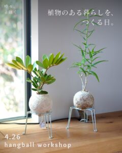 さらに、26日(日)には空間を彩る植物「hangball(ハングボール)」のワークショップと展示販売が開催されます。