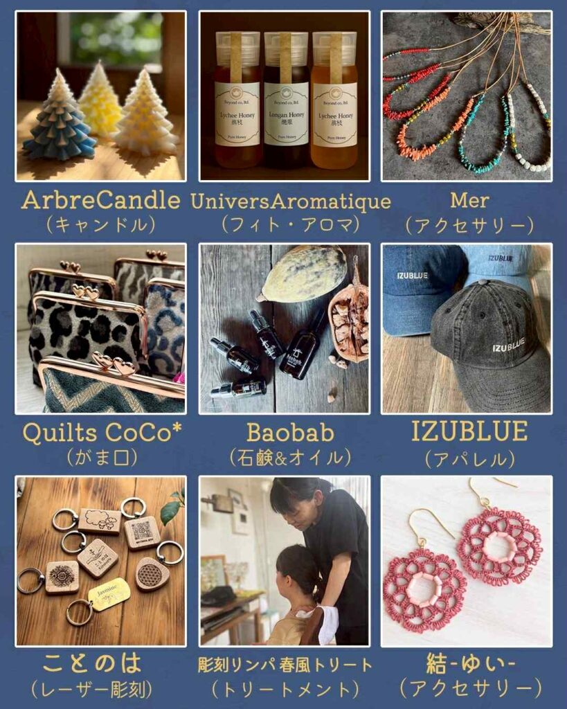 アクセサリーや雑貨などのハンドメイド作品、体験型アートやセルフケアに役立つトリートメント、地元食材を使ったお弁当やスイーツなど、さまざまなジャンルの出店が並びます。